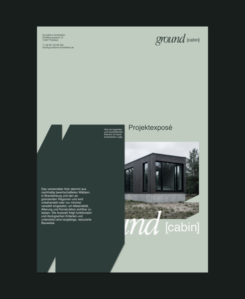 Ein Design zu entwickeln, das die Cabin stimmig wirken lässt, ohne sich in den Vordergrund zu drängen. Der Auftritt sollte den Charakter der Architektur aufnehmen und gleichzeitig interessant bleiben. Gerade beim Exposé ging es darum, nicht wie ein austauschbares Verkaufsdokument zu wirken, sondern eine eigene Designsprache zu finden, die sich vom Gewohnten löst und den Charakter der Cabin klar nach Aussen transportiert.