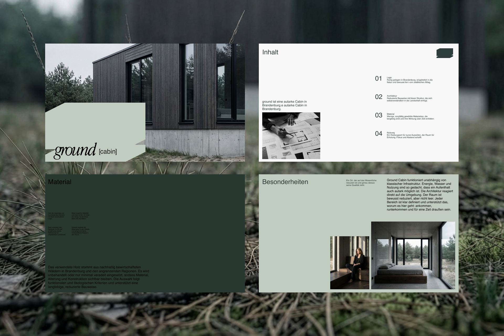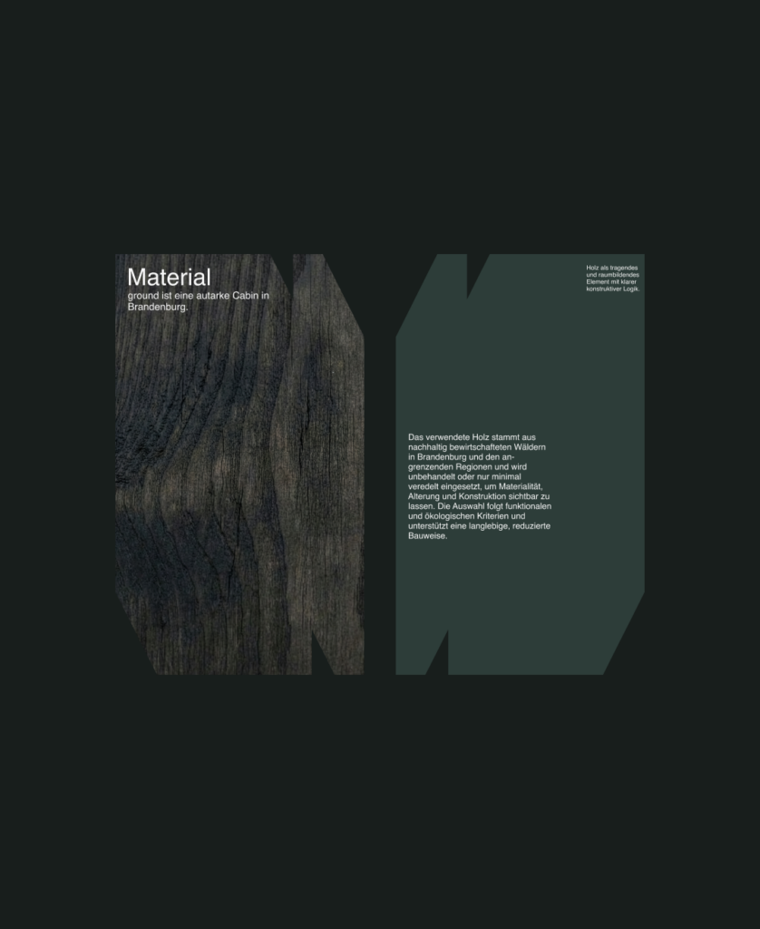 Ground Cabin ist ein Konzept für eine autarke Cabin in Brandenburg. Entwickelt wurde ein Logo & Markenauftritt mit einem digitalen Exposé, das sowohl für den Verkauf als auch für die Zwischenvermietung funktioniert. Ziel war es, Architektur, Nutzung und Gestaltung so zu verbinden, dass ein stimmiges Gesamtbild entsteht.